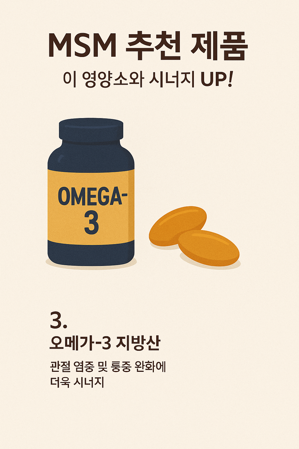 - 오메가-3 지방산:뛰어난 항염증 효과를 가진 오메가-3는 MSM과 함께 섭취 시 관절 염증 및 통증 완화에 더욱 시너지를 낼 수 있습니다. 전반적인 혈액순환과 세포 건강에도 긍정적입니다.