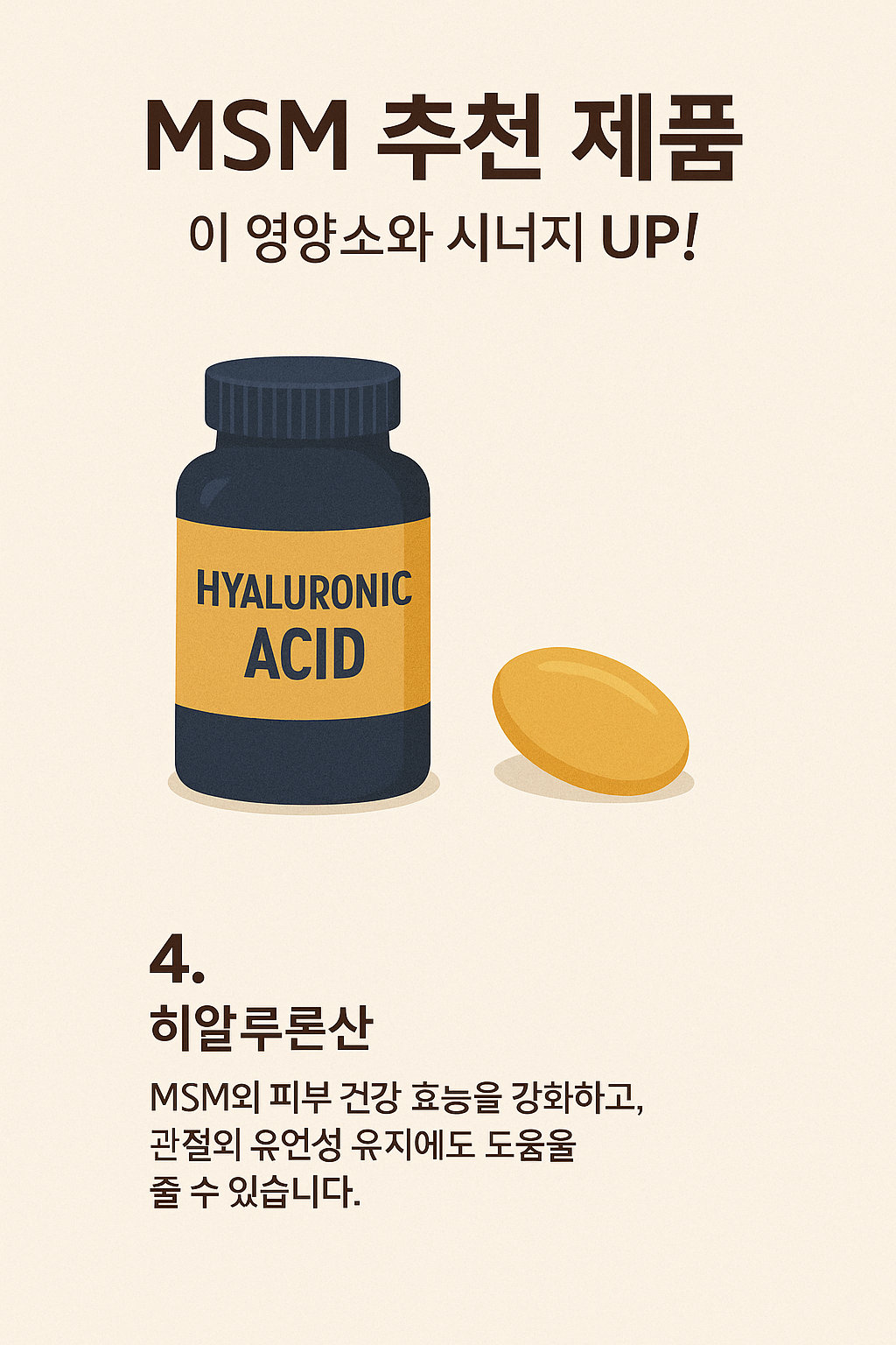 - 히알루론산:강력한 수분 결합 능력으로 피부 보습과 관절 윤활에 중요한 역할을 합니다. MSM의 피부 건강 효능을 강화하고, 관절의 유연성 유지에도 도움을 줄 수 있습니다.